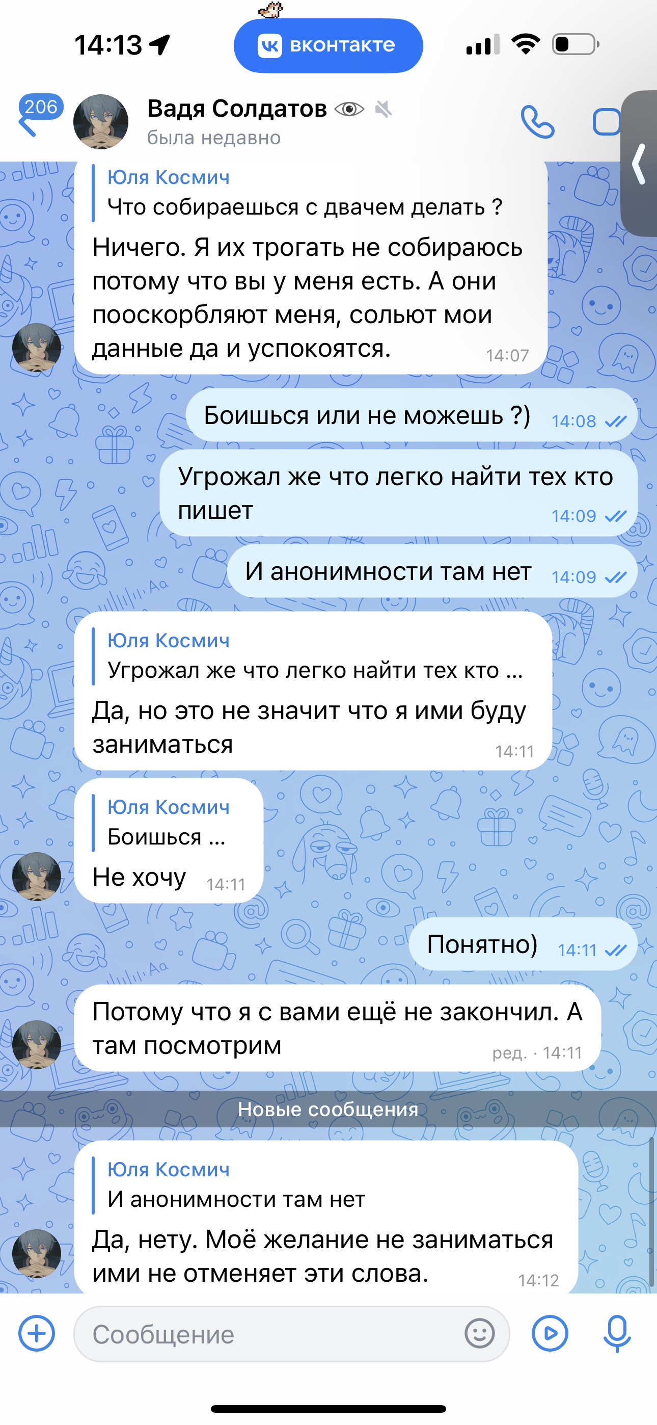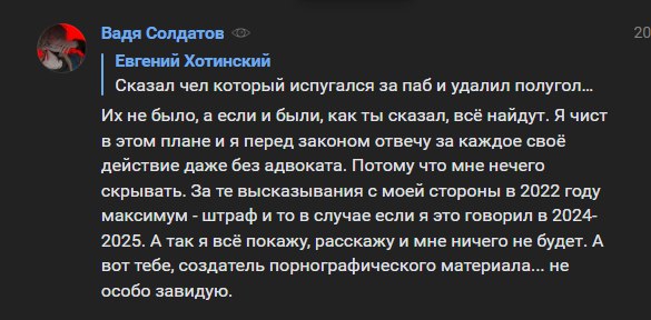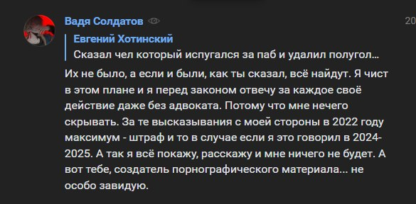 >>25003295 (OP) О, так Вадя плачется, что нас на него натравили. Так то оно может и так, но вот только он сам сразу зашёл с угроз треду, как привык с вкашными хомячками делать, чем сам настроил набегаторов против себя. Ну пускай разгребает теперь, лол, а мог всё решить за пару постов в этом итт треде и у себя в группе.