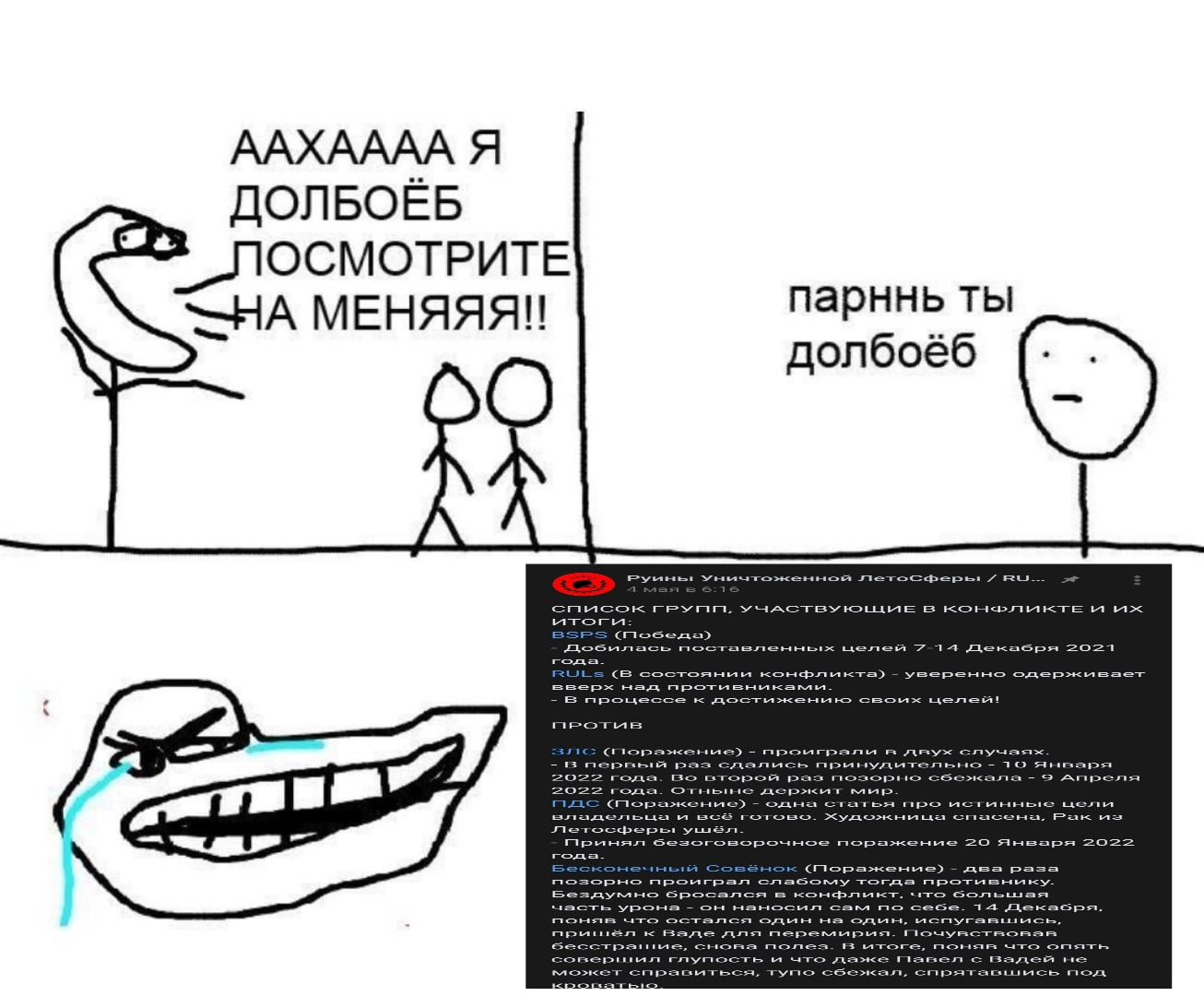 Если кто мониторит оставшиеся фистунские группы - глядите в ближайшее время, у них могут случаться подгорания срак по поводу такого расклада. Если вдруг у кого окажется доступ к речам Петухипстера по этому поводу и будет возможность без палева слить - не упустите такую возможность, это ж может получиться вин на уровне ВСЁ В ГОВНЕ. Мнивший себя безнаказанным и всемогущим коммерс оказался попущен, причём крайне унизительно.
