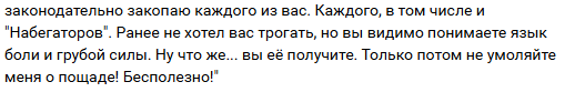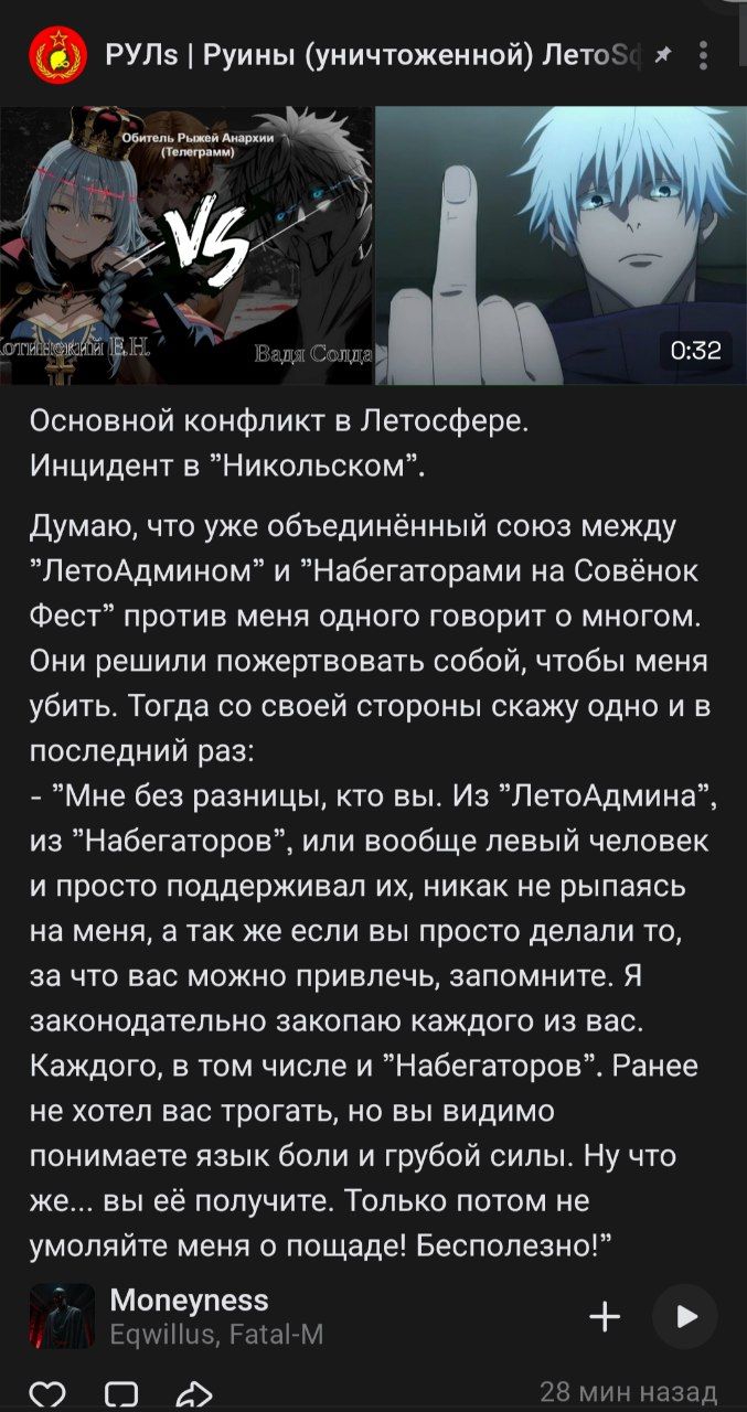 После блокировки его группы он вообще молчал месяц, и потом изошелся на лютое говно и зашизил ещё больше. Видимо сейчас тоже ульту копит, хочет выкатить пост как он нанес кому то реальный вред. Вообщем пидор
