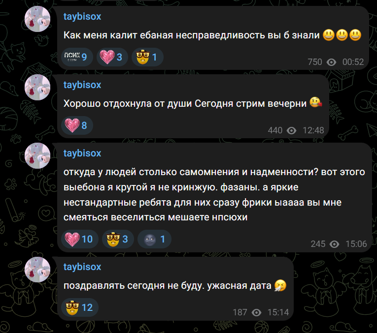 вся движуха ненормовой последние дни насквозь фальшивая и имитированная поддувание проплаченному форсу с котлами баны фриков из чата, к которым давно привыкла десятки залетных юзеров без фоллова с вопросами про ее дела