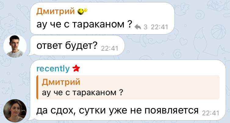 >>25166588 таракан наныл на заказ очередной шабы. владбойз вызвал шабу из лайнера, она пришла, а таракан просто заснул и не открыл дверь. шаба стала гундосить и жаловаться владбойзу что подъедут здравые с надроченными с илюхой поговорить. поэтому вчера таракан целый день онлайн не был нигде вообще