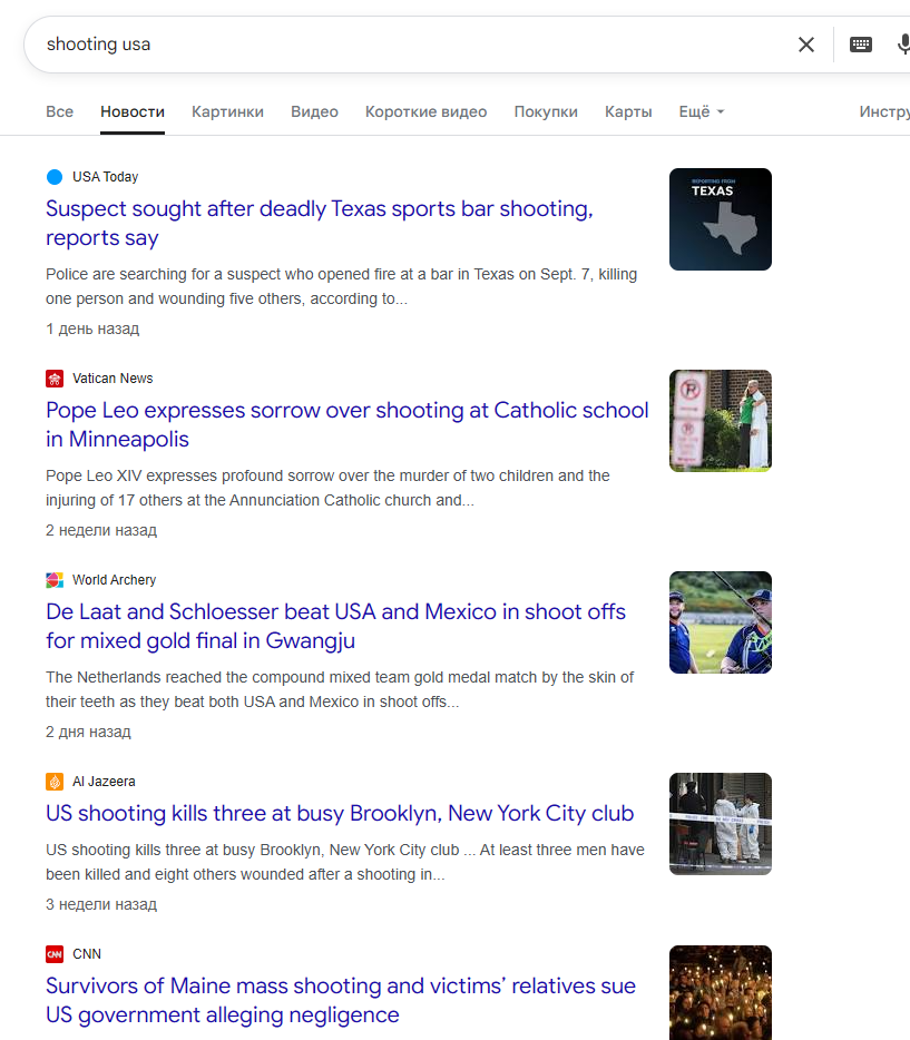 >>25173292 зайди под впн юса чтоб лучше показывало и прост введи в гугле шутинг. там тупо каждый день где то стрельба, каждую неделю масс шутинг где то ну и скулл шутинг щяс где то раз в месяцок-2 стабильно если на шутинг похуй всем там то на ножики уже и подавно всем похуй