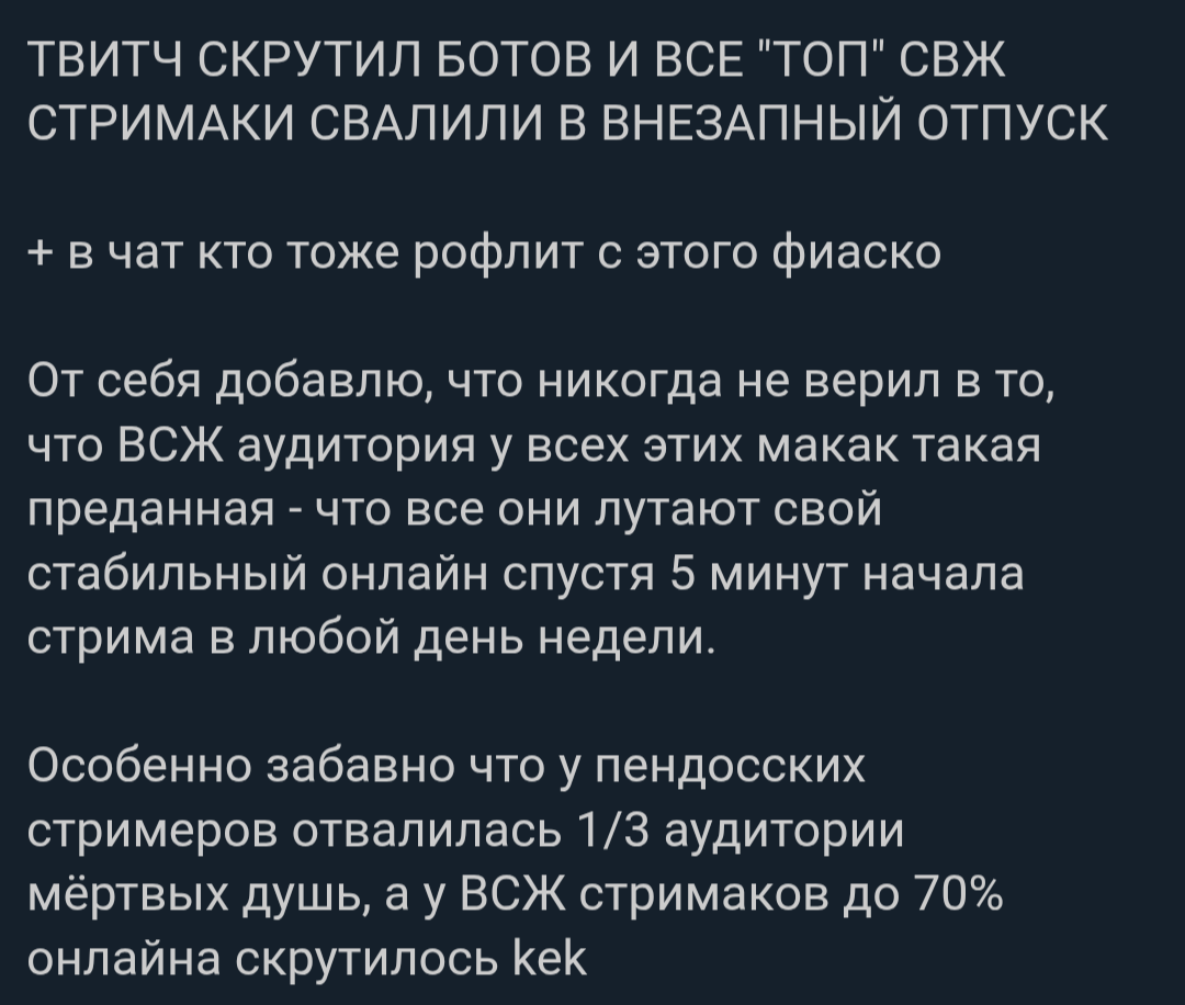 Тут даже на графике видно подтверждение ее честности. 7 августа, стрим в четверг не по графику, на нем видно, что зрителей меньше и среднее количество почти вполовину меньше обычного. Почему? Потому что привыкли к стримам по воскресеньям и не пришли на внезапный стрим. По идее если она крутит, то накрутила бы до своих средних значений. Но мы видим реальный просед по зрителям, что абсолютно железно доказывает отсутствие любой накрутки. Клоуны с вскукареками про накрутку железно слиты этим фактом.