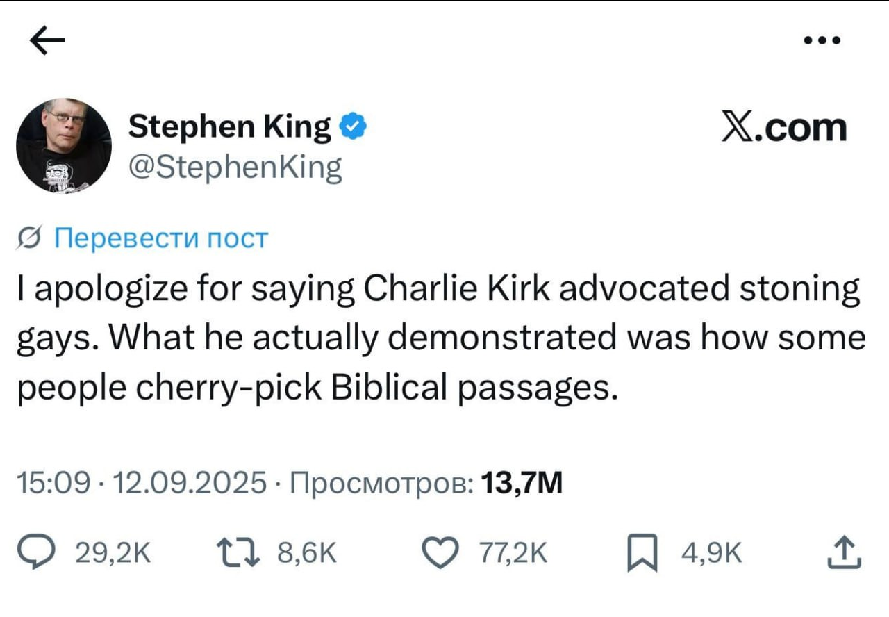 Стивена Кинга массово отменяют. Писатель заявил, что застреленный Чарли Кирк призывал «забивать геев камнями». Кингу быстро ответили, что Чарли Кирк никогда такого не говорил. Осознав, что он может столкнуться с миллионными исками за клевету, Кинг удалил пост, начал в панике извиняться и написал, что такого больше никогда не повторится.