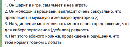 Те кто сомневается в онлайне никса на Инте просто долбаебы. Дота все еще очень популярна в России. Да, многие уже не играют сами, но турик смотрят. Тем более у нас дохуища народу подсажено на ставки и кто шарит за киберспорт - на доте и кске ставят всегда. Я сам бы грузанул и глянул пару матчей если бы щас играл на буках, но я ушел в каз. Короче, по моим подсчетам финал и должно было смотреть 300-400к, если бы играла наша команда было бы под лям. Пассивная популярность игры по сути не падает, игра за счет нее и живет щас. Те кто уже скуфами стали и не готовы ебать мамку в пабе - они готовы сделать ставочку или просто позырить матч. Да и повторюсь, активно играет в нее дохуя русскоговорящих. Игра актуальная. И эти пассивные и активные дотеры, все они смотрели никса. Поясню почему 1. Он шарит в игре, сам умеет в нее играть 2. Он молодой и красивый, выглядит очень сексуально 3. На удивление может связать много слов в предложение, что для киберспортсменов (дебилов) редкость 4. Нет этого ебаного кринжа, продакшена и ощущения, что тебя кормят говном с лопаты. Просто молодой красивый парень сидит у себя на хате и без истерик талантливо комментирует. У него если есть накрутка, то минимальная, от самих буков, от встроенных плееров и так далее. Тут скорее стоит удивиться, что на офф касте и у других стримеров кто-то сидел. Вот там да, хуйня. А сам никс чист как залупа под рукомойником. Я удивлен, что он и на обычные стримы не крутит по 100к, а сидит скромно. Раньше, кстати, так же было. Настолько уебищные все эти офф касты и хаты дотеров, что их долбил папич по онлайну. А никс посильнее папича будет в плане медийной привлекательности.