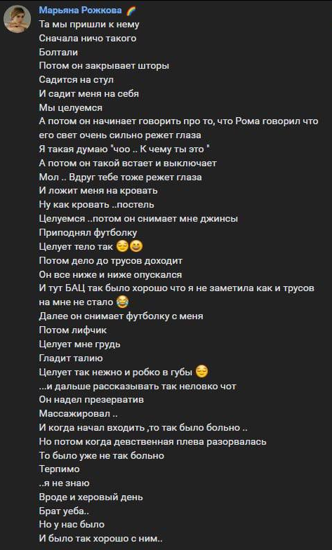 Девушка слила их старую переписку, где тогда 14-летняя девочка в подробностях ей описала, как все происходило. А также добавила, что она не хочет так спасать репутацию Вани, ей просто не нравится подобная спекуляция от Марьяны, чтобы унизить бывшего.