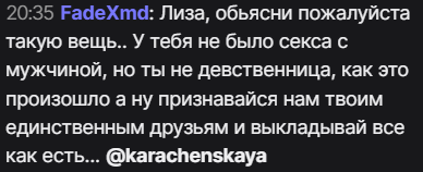 Стоит ли говорить, что вся порядочность и «замуж» это пиздеж, Блядину просто все нахуй посылают и сбегают от нее, даже жирный казах ее френдзонил на стримах, так бы давно выепали под алкашкой, желающих не нашлось, к тому же, она сидит всегда дома и мужиков не видит, ситуация не подвернулась