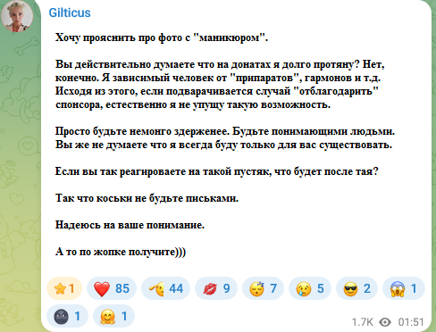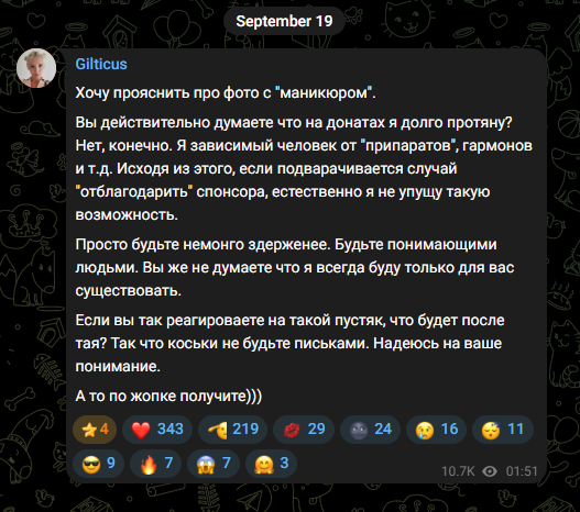 Похуй, всёравно это пук в лужу. Симпы проглотят ее измены как проглотили её постоянный пиздёж. В симпы идут люди у которых итак самооценка на 0. Всю их жизнь об них вытирали ноги, теперь это делает Женя, а они и не против. Удачный симбиоз получился, все счастливы)))
