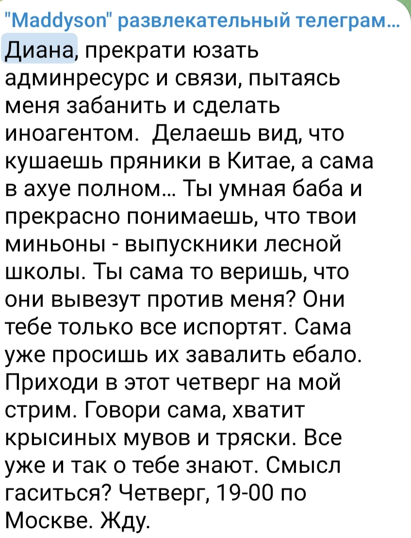 >>25233257 У симонихи нет никакого админ ресурса. Она сотрудничала с режимом, но сотрудничала как мне кажется недостаточно, поэтому режим был ей недоволен. Отдельное недовольство режима вызывает тот факт что Жаба оттягивает на себя какую-то часть русскоязычных стримеров и делает их слишком независимыми. А режим хотел бы что бы они были зависимы от него. Поэтому мне кажется вся эта голимая провокация затеяна чтобы нахлобучить обе стороны: Жабу и её контору нахлобучить за то что она в интернете якобы аббузит стримеров и посылает своих миньонов причинять им какой-то вред, а Чмодье нахлобучить просто потому что переехав в Америку он стал слишком независимый и совсем уже от кремлевского ошейника отбился.