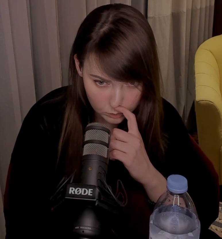 Сняла берет потому-что чат намошнил, что она похожа на Сергея Драгунова из серии Tekken. Снова ныла о том, как ей хочется картошечки фри, стрим без нытья о еде, уже не стрим. Агрессирует чаще, без вкусной жратвы, сходит с умао чем сама упоминала вскользь...