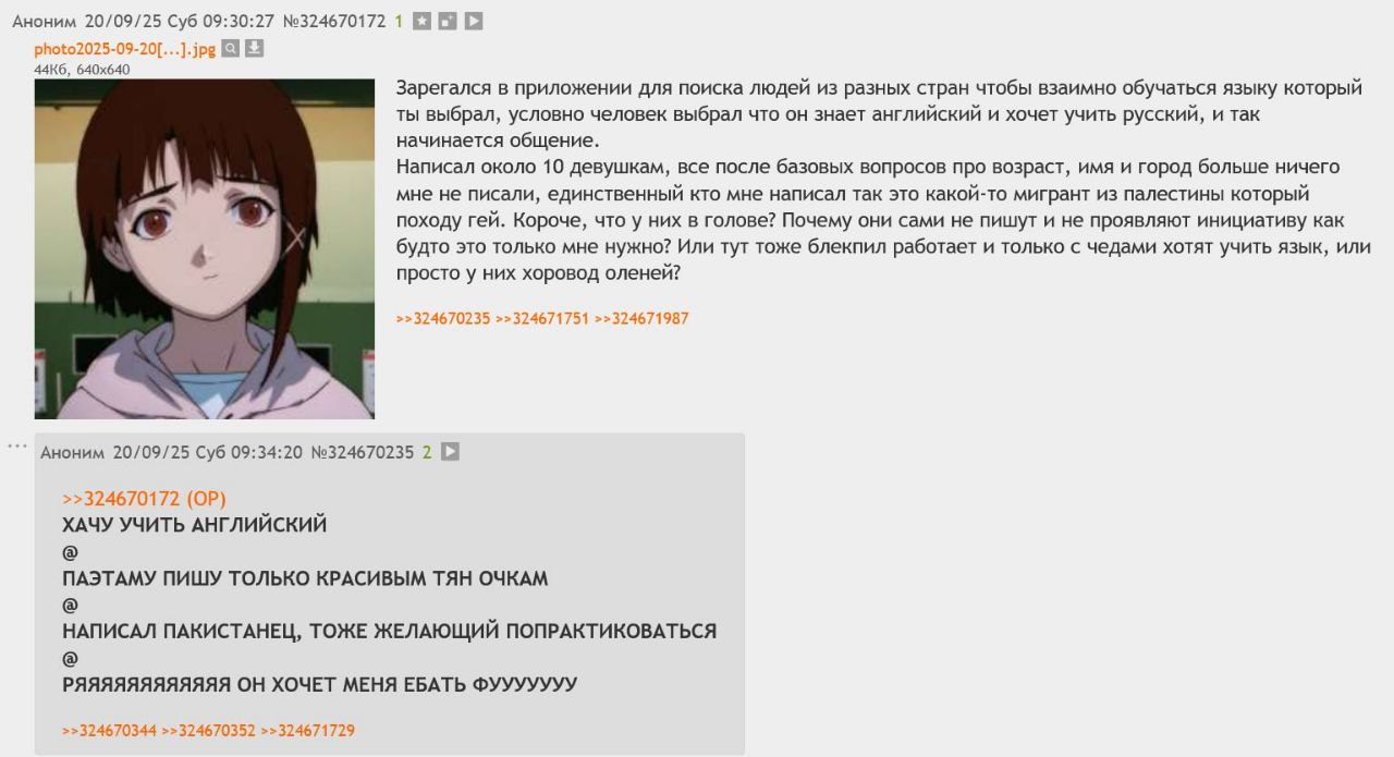 >>25243436 Вся суть геосраскеров. Но тащемта, всё это хуйня, изучение языка через приложение, как и вот эта хренотень хуй пойми с кем. Знавал одну деваху лет 15-17 назад, которая тоже грезила японодрочерством, но так она и училась на востоковедении и японский изучала с дедом-репетитором, который лет 20 проработал на две страны, то на джапку, то на Р., ну я уже не помню кем он там точно работал. И он же ей и помогал потом перебраться туда, даже всю бюрократическую хуйню помогал ей порешать. Один хуй, более-менее она смогла в бурятский язык только уже пожив там.