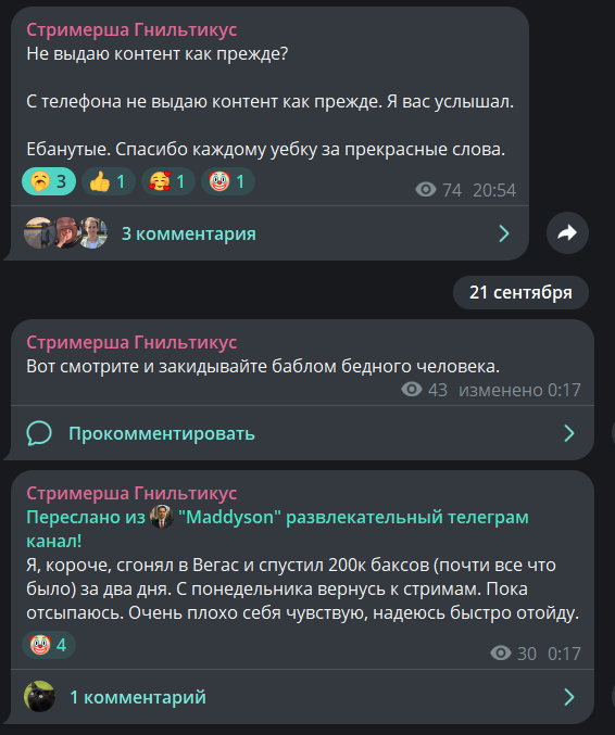 Ладно, это было забавно пару раз, когда он в Москве притворялся нищим (пробухал последние 50 тысяч, посоны), на деле скупая десятки квартир и выкладываясь в крипту. Но он опять завел эту шармаку с "пробуханными/проигранными" деньгами, являясь долларовым мультимиллионером. Уныло, пиздец.