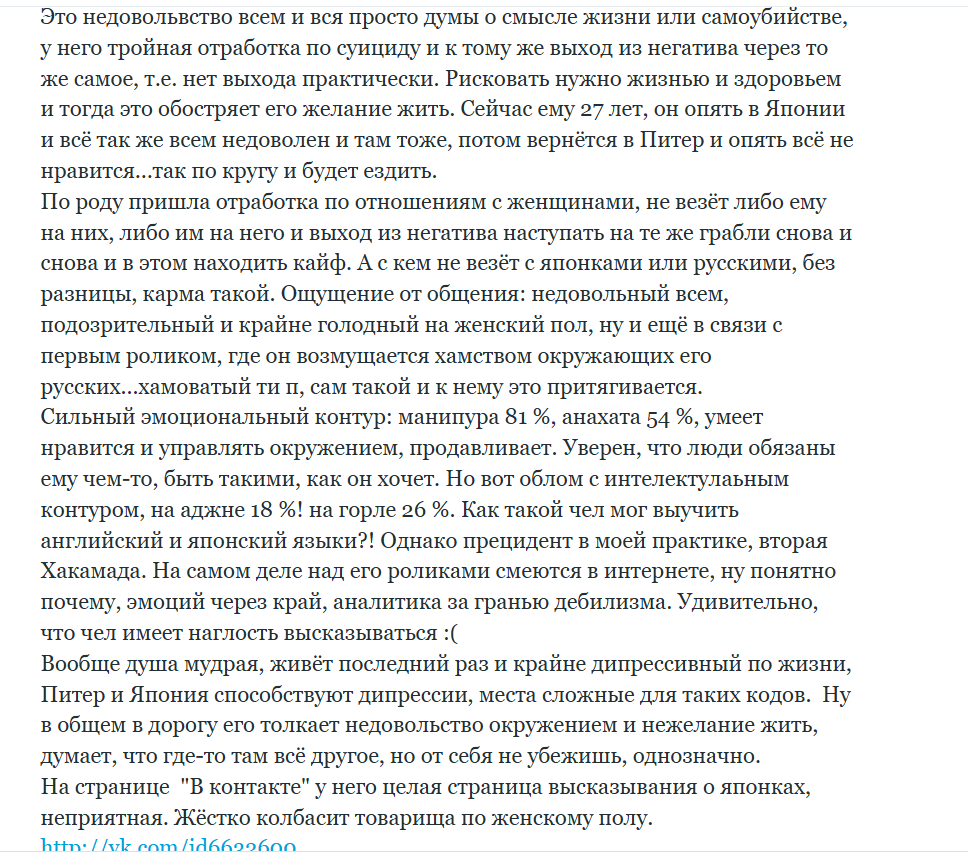 Не знаю обсуждали ли это итт или нет, если было, то извиняюсь. В живом журнале есть одна любительница нумерологии, и конкретно метода Бухтоярова. Там если вкратце, используя дату и время рождения можно получить различную информацию о человеке. Так вот, эта нумеролог, так как сама в свое время жила и работала в Японии, списалась с Бобой, ну и сделала ему персональный рассчет по этому методу. В общем, по ее словам, у него очень слабый интеллектуальный потенциал и она удивилась, как ему вообще удалось изучить японский язык.