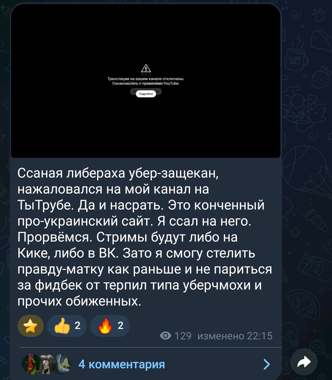 >>25132304 (OP) Ссаная либераха убер-защекан, нажаловался на мой канал на ТыТрубе. Да и насрать. Это конченный про-украинский сайт. Я ссал на него. Прорвёмся. Стримы будут либо на Кике, либо в ВК. Зато я смогу стелить правду-матку как раньше и не париться за фидбек от терпил типа уберчмохи и прочих обиженных.