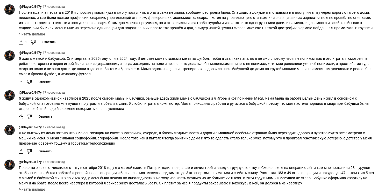 Захожу на канал Дневник Девственика почитать смешные комментарии. А там постоянно какой-то шиз срет пастами.Видимо его банят и он создает новые аккаунты. Вот 2 часа назад создал новый и высрал 26 постов под последним видео. Это какая паста с двачей или реальный шиз пасется у гнилозубого дрыща?