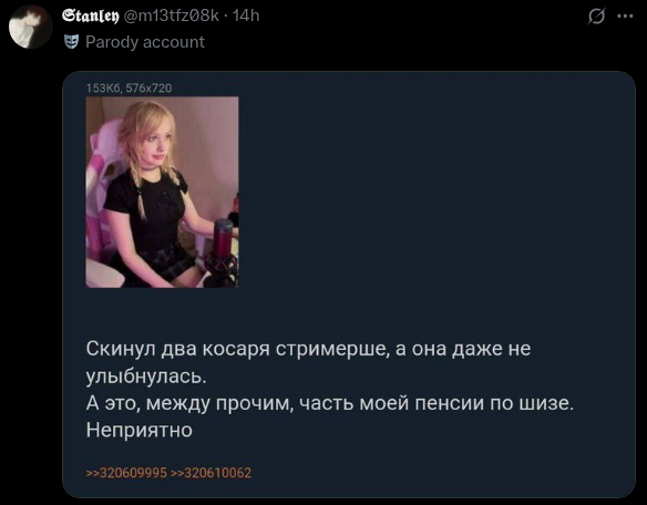 >>25251614 даун конечно же забыл отметить, что вилат и топовая трансляция ру доты от студий уже ушла в момент пика никса, и нынешняя офф транса вызывает блевотину у большинства людей(достаточно на киберспорт зайти). Ну это мы конечно же опустим