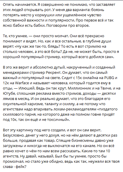 Подождите, рекрент это же челик который стримил всю жизнь на косарь онлайна и барахтался где-то около кефирного голема по онлайну, когда их обоих звали в команду, то это было "к кексу прилип рекрент" а не наоборот, а тут оказывается что он медиа гигант Аля бустер, это когда так стало? Они вообще ебанулись с этими цифрами