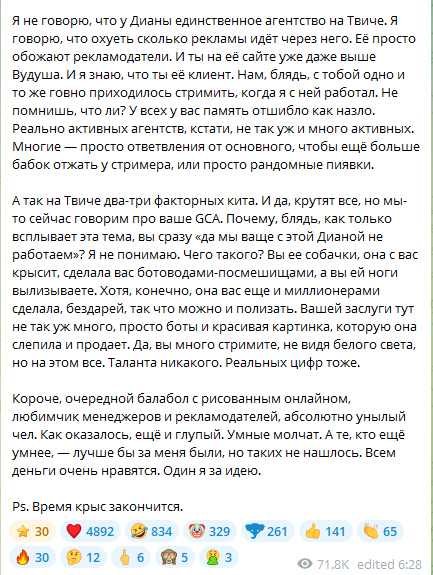 >>25252124 Ему написала Динаблина на стриме и у него было 2 нищих рекламы по архейдж и кораблям. Админ тг канала подсос-тред возбудился и запостил у себя их, и оттуда пошел массированный хейт. Есть мнение что это Арчидос через своих миньонов поднасрал Прадену и теперь ему везде пишут хейтерские комментарии.