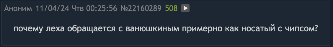 >>25257167 тут про рыжего начали спамить эту хуйню, только после байтов жировиков про леху, так что все очевидно, до этого только уводец мог себе такое позволить писать, симпы морфи и лехи очень ранимы