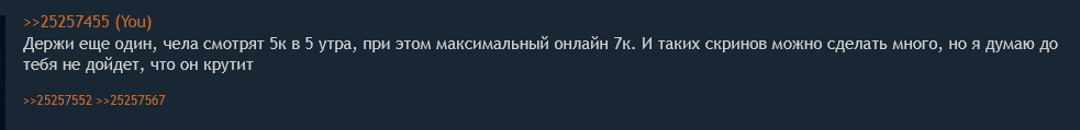 >>25257455 Держи еще один, чела смотрят 5к в 5 утра, при этом максимальный онлайн 7к. И таких скринов можно сделать много, но я думаю до тебя не дойдет, что он крутит