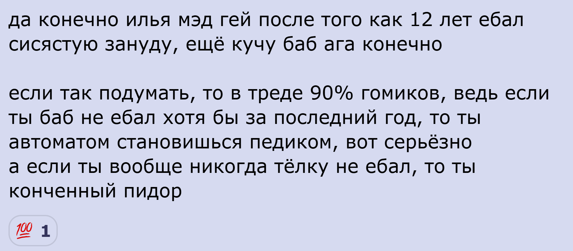 >седня у меня выходной хочу и сижу тут попуская симподаунов Это же каким ебучим дегенератом надо быть, чтоб так спалиться на пиздеже) Малыш, нормальные люди сидят в треде только в рабочее время. Только ноулайферы дегенераты будут выходной тратить на эту помойку