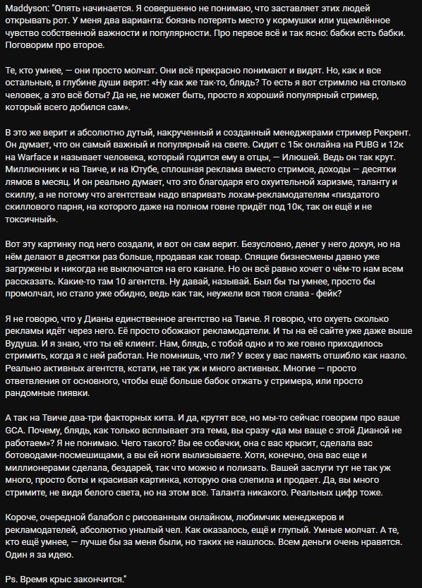 Я кажись понял что у деда так пригорело. К нему с рекламкой пришли, а он им - прорекламирую любой млм или казиныч только 20 лямов дайте. А они такие - ты чо дед ебанулся у тебя зрителей нихуя уже. Мы у твичевских ру звёзд с большими просмотрами закажем в 5 раз дешевле. лучше.