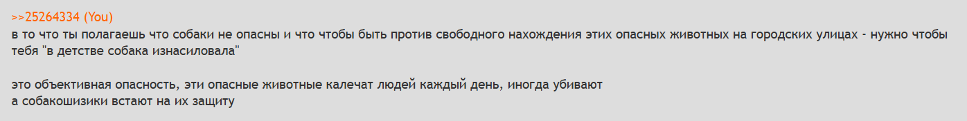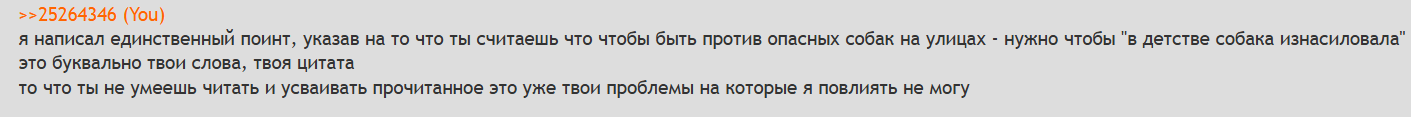 >>25264346 я написал единственный поинт, указав на то что ты считаешь что чтобы быть против опасных собак на улицах - нужно чтобы "в детстве собака изнасиловала" это буквально твои слова, твоя цитата то что ты не умеешь читать и усваивать прочитанное это уже твои проблемы на которые я повлиять не могу