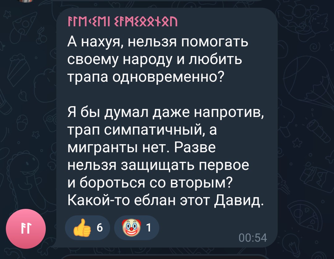 >>25267725 > зацикливаться Обращать внимание. Нельзя не обратить, когда они повсюду и общество не кладёт их в психушки > на ненависти Не ненависть, а здравое желание убрать разлагающий общество элемент. Несмотря на диагноз, часть моральной ответственности они несут, а значит, применить к ним санкции (в крайнем случае разбить ебальник) необходимо. Когда общество созреет, эти выродки не успеют сбежать, и спрятаться будет негде, они всех заебали