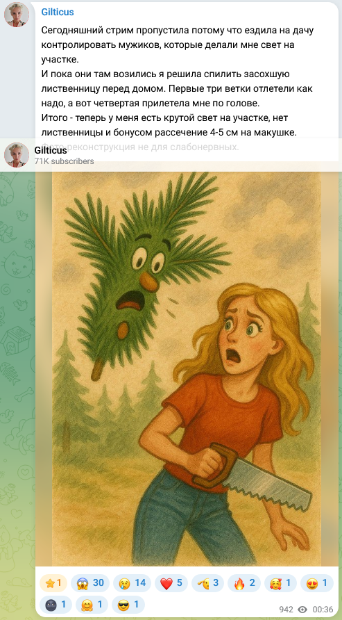 Сегодняшний стрим пропустила потому что ездила на дачу контролировать мужиков, которые делали мне свет на участке. И пока они там возились я решила спилить засохшую лиственницу перед домом. Первые три ветки отлетели как надо, а вот четвертая прилетела мне по голове. Итого - теперь у меня есть крутой свет на участке, нет лиственницы и бонусом рассечение 4-5 см на макушке.