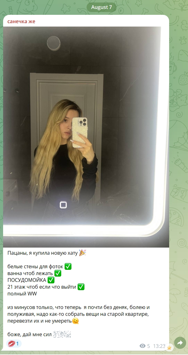 >>25265283 Кароче новую теорию выстроил. Раньше когда она онлик себе набивала, типа фильмами, поездками в гараж и на дачу, я думал это чтобы чсв потешить, ну типа пунктик такой, тысячницой себя все время называет, надо было чтобы тыщу в месяц средняя выходила, а возможно это было набивание статы чтобы кабанчику-лохичу впарить себя, через Алину-диану.