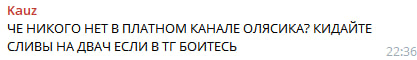 >>25270106 Да никто нихуя не сообщает, они точно так же у Даши мочуха в личке попрошайничают. Просто им она скинет, потому что уже два года в канале сидят и проверенные, а свежедобавившемуся анону нет, ещё и забанит если будешь назойливым. Пиши Хрюну (SB ник), Андрею (аватарка с симпсоном), Diana P, Varna, Ведьмук. Кто-нибудь точно поделится
