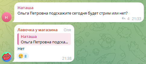 Ольга как стримерша закончилась несколько лет назад. Ее стримы здесь не обсуждаются (потому что нечего обсуждать) и вообще их смотрит в лучшем случае один-два анона.