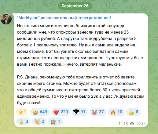 Несколько моих источников близких к этой клоунаде сообщили мне, что спонсоры занесли туда не менее 25 миллионов рублей. А накрутка там подрублена в разрезе 5 ботов к 1 реальному зрителю. Ну вы и сами все видели на моем стриме. Вот бы узнать сколько заплатили самим стримерам с этих спонсорских миллионов. Чувствую мы бы с вами знатно поржали. Ничего, затерпят маленькие.