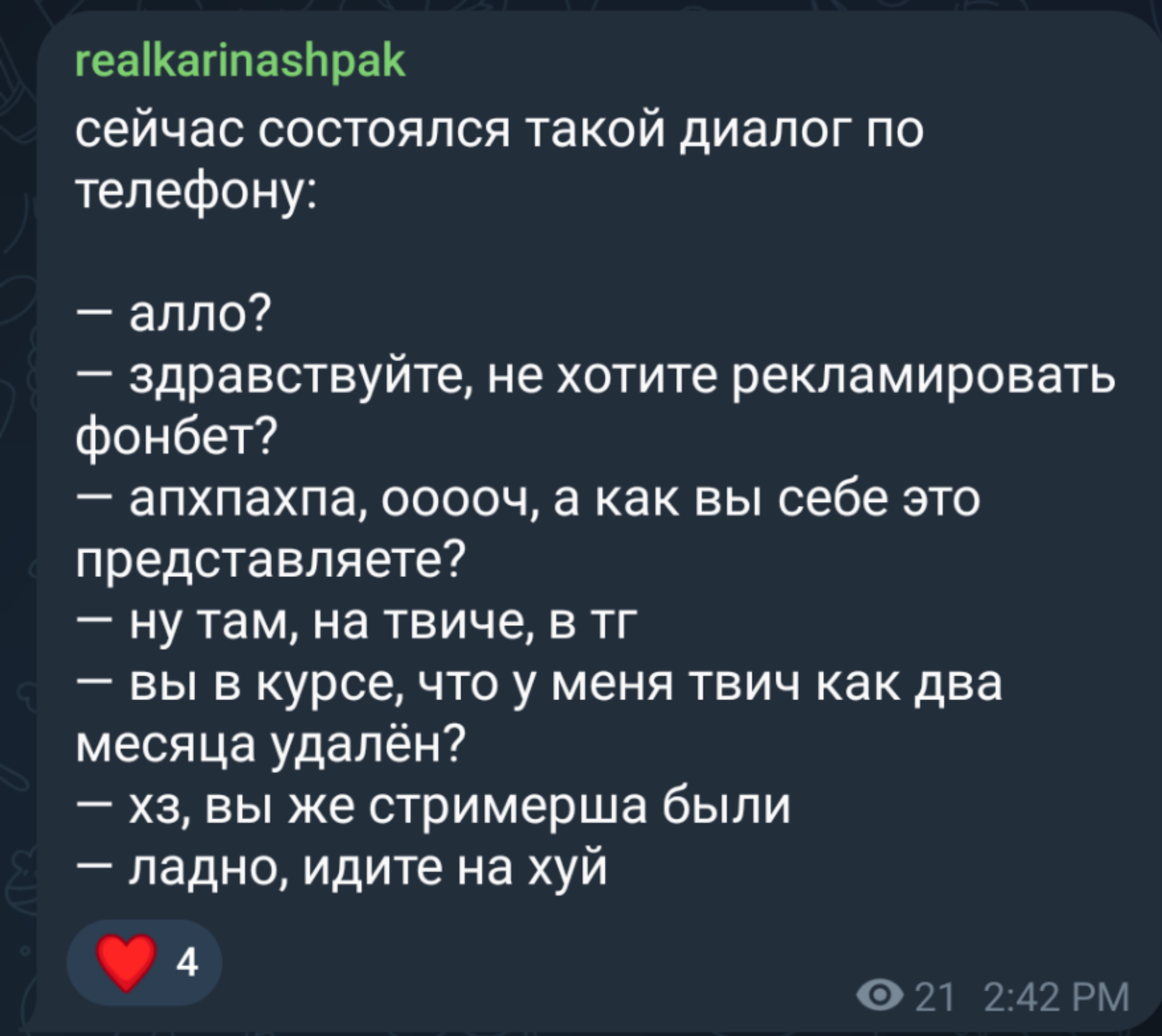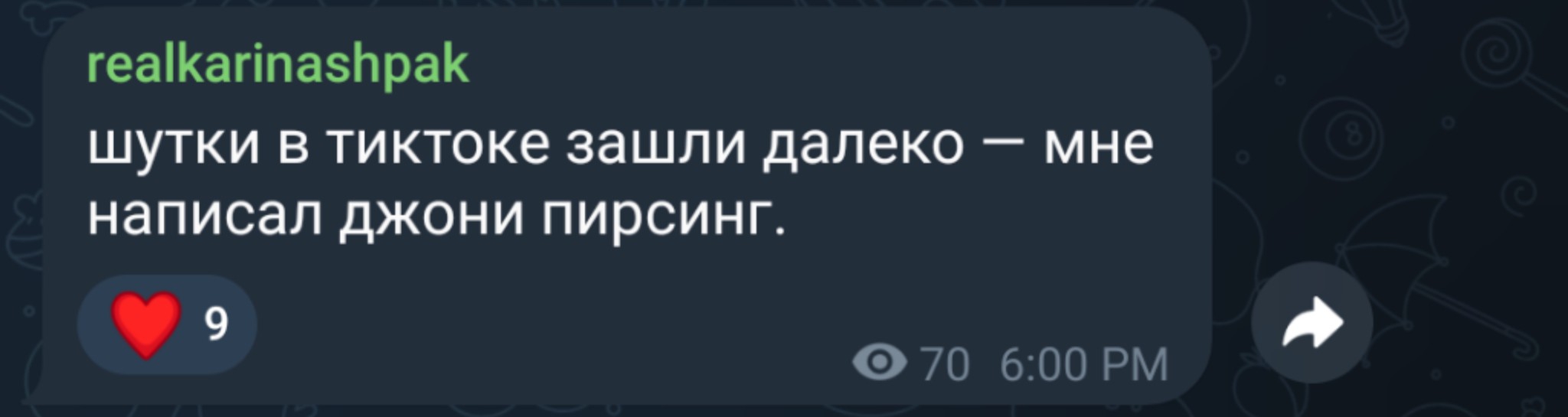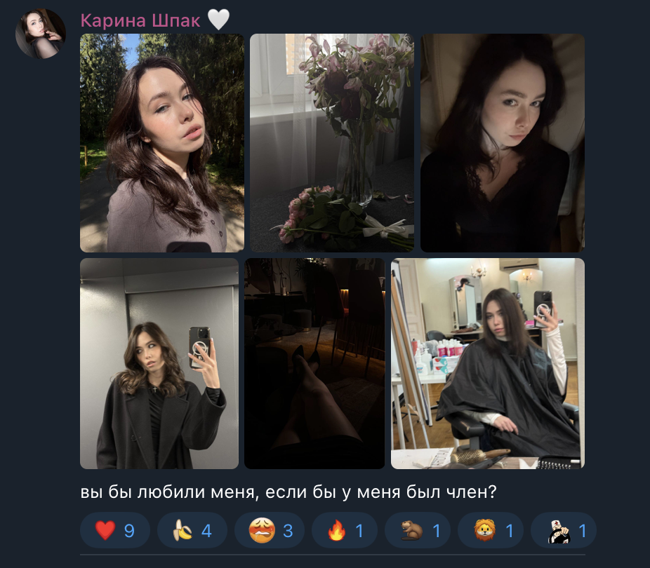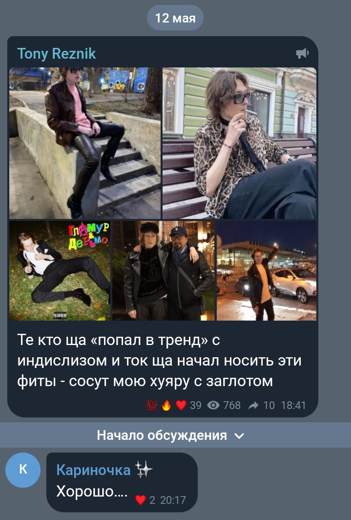 Там Карине написал какой-то популярный тиктокер. Шпак по прежнему пользуется спросом у зумеров с шилом в жопе. А вы говорили... А сколько ей пишут, про которых она не говорит??? Зависть присутствует? А у Тони резника ревность присутствует? Типаж похожий, как будто из тусовки кузнецкий свад. Я бы ревновал. Я даже сейчас ревную