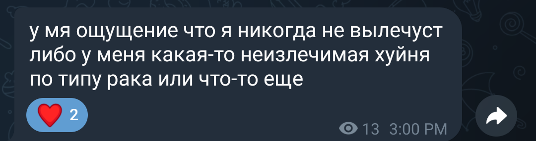 >>25002166 Это не просто так она про смерть написала. У Карины депрессивные мысли уже долгое время. Я натыкался на стрим ~2019 года. Если ничего не путаю, там она рассказала что почитала какой-то рассказ Кафки, тошноту, кажется, и после прочтения она потеряла смысл в жизни, начала думать о смерти, о том что все бессмысленно, ТК она все равно умрет