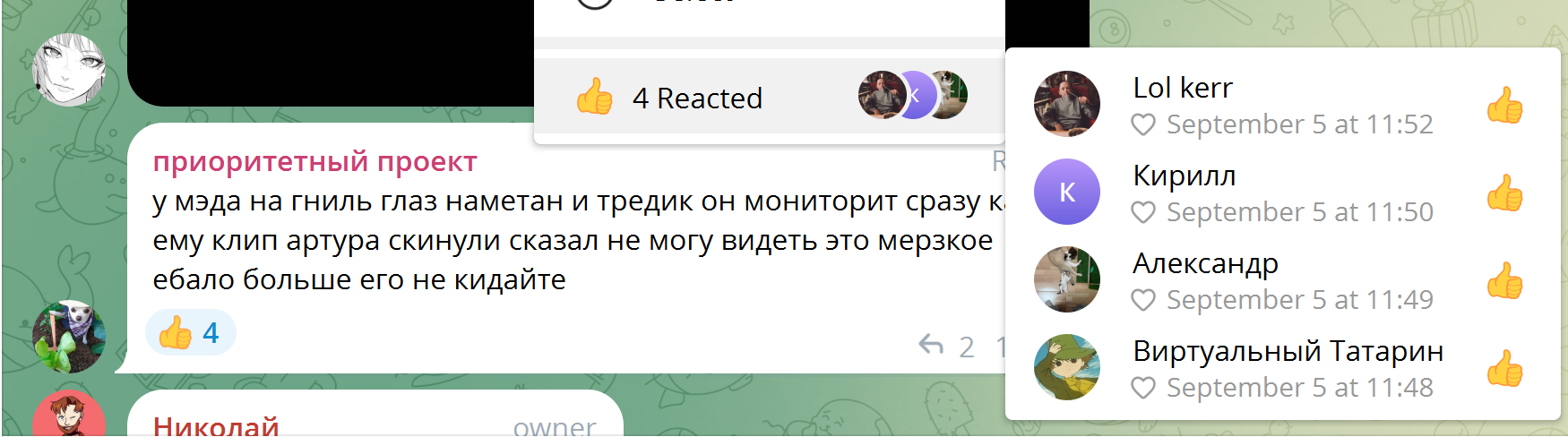 >>25270891 3 скрин наглядный пример обженного пидораса по типу сашули, (он собственно и лайкнул эти высеры) а татарина удивлен здесь увидеть, в тг чате у Артура прям добрячок-соевичок