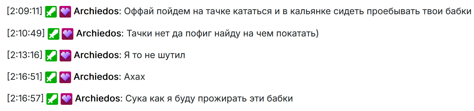 Ребят это я, Арчидос. Читаю как вы жалуетесь на то что я вас баню, но вы никак не уловите основного посыла. Сейчас новая эра, новый прайм, и гнили не место среди нас, поймите. Нужно быть добрее и любить меня и моих девчонок. Писать удобные сообщения в чате, в донатах, и тогда я ни то что не забаню, а даже випку выдам или модерку. Неужели этого мало? Перестаньте меня называть тетушкой соей и булить Мариночку. Будьте примерными степашками, и я расцелую ваши попки, я разве многого прошу?? Ну серьезно, заколебали уже, никакого желания подрубать поток уже нет после прочитанного, а мы вчера старались между прочим.