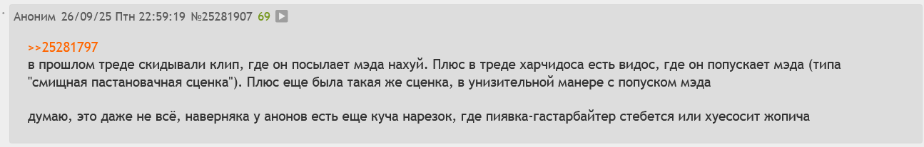 >>25270891 > шизоид бегает по каким-то телеграм-помойкам, занюхивает каждый пук где что не так сказали про его кумира харчидоса