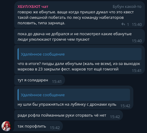 Таки давайте посмотрим правде в глаза - бегунки соснули. Они приписали себе отмену феста в 2023 из-за заезда ректората, но сейчас были вынуждены униженно наблюдать за тем, как Пионеры в форме отдыхают в Волге. Так что хуионер и хуйбой зря получали пиздюли.