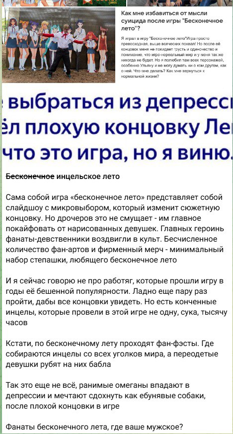 Если вкратце, то БЛ2 как продолжение оригинала возможен только если Рита и Смолев подружатся и вместе запилят, остальные эрогеи не будут против, ну скинутся орике на шоколадку. Смолев пытался в игродел и после "Тонина Тетрадь" так ничего и не родил. Если БЛ2 и выйдет, то уже с другими персами. Создать летонько в лагерьке не то что бы и сложно, много мододелов повторили вайб оригинала и даже доработали. Но тем самым Бесконечным летом от анонов к анону, оно не будет. Такова суровая правда. Можно, что либо изменить? Можно. Всегда можно и я даю подсказку. Но уяснить надо следующее, Бесконечное лето уже вышло и ты его уже прочитал.