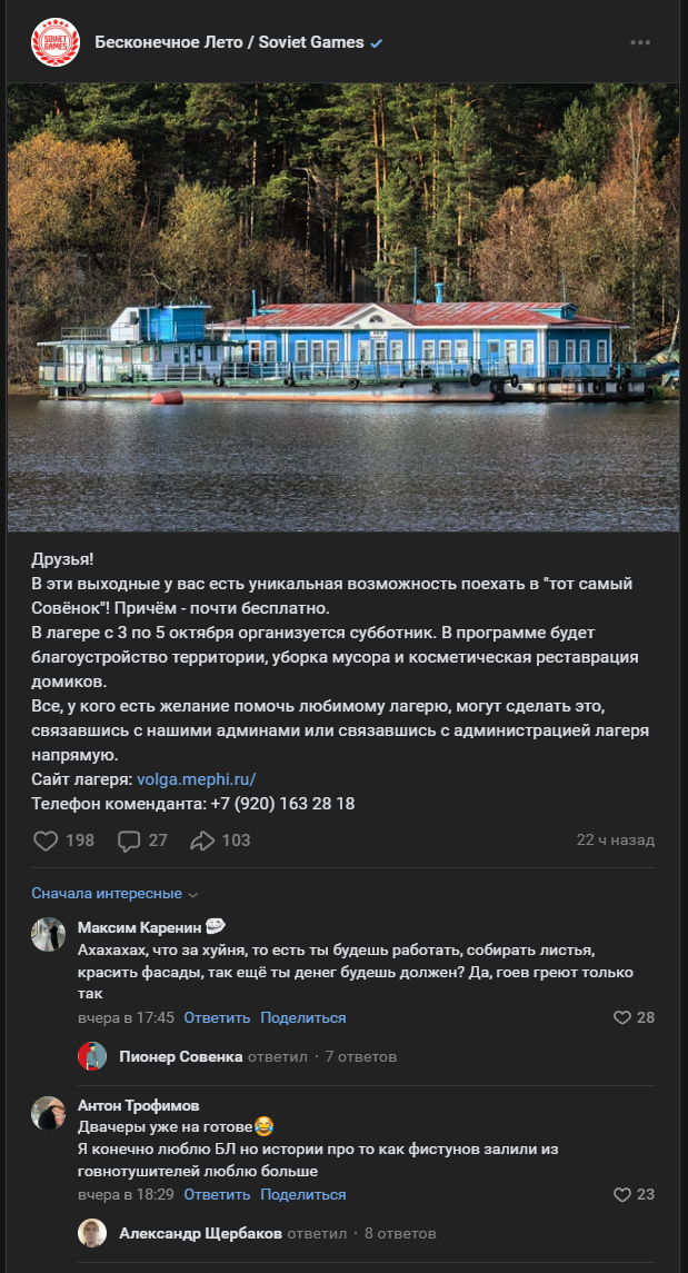 >>25122172 Так, если в целом и по порядку объясняю что произошло Я приезхал 30 августа в лагерь не один, а кое с кем Подходим мы значит к лагерю, а ворота открыты и слышим гимн России (праздновался день речного флота Твери, да, такое праздник есть) В ахуе, захожу быстро в лагерь и иду к регистрации, чтобы арендовать домик, и по дороге мы с моим компаньоном наблюдаем картину маслом Толпа пионеров в пионерской форме идут в окружении косплеерш Слави и Лены Мы сразу подумали, что это их Биба каким-то образом уговорил прийти на так называемую сходку И зайдя на стойку регистрации мы услышали, как коменде по рации говорят "Марья Ивановна, организатор ФЕСТИВАЛЯ приехал, припарковал машину, попросил помочь в разгрузке" В моей голове пронеслись мысли "Это Марков? Лысый? Биба на своем пазике приехал?" Но я был быстрее, так как недалеко от лагеря как раз проходил другой фестивали, не связанный с БЛ (Либо фестивали МИФИ, либо просто какой-то музыкальный фестиваль, я так и не понял)