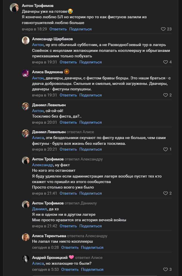 Ну а после всех эти ахуительны историй я пошел купаться в Волгу и пожалел об этом, тк вода была ледяная и кукушенка ищи свищи Потом мне Лексус подарил пиво на плаже и скрылся Далее, в 17:00 приехали на место Гвардейцы и высматривали Лексуса, тк он чето пиздел на них (по их словам) Гвардейцы начали объяснять косплеершам, что за цирк с конями тут происходил в период 2018-2023 года и параллельно снимать скрытую съемку (асуждаю), тк они вообще не были связаны с Фистом, только Маркова хуесоси, но не помню по какой причине (этих косплеерш Рита Тайнакова выкладывал к себе в группу по БЛ)