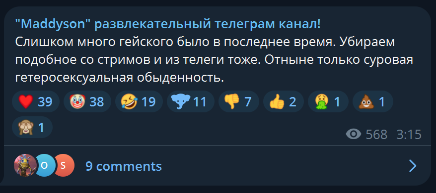 А вы заметили что гейские шутки реально стали менее популярны? В десятые годы все любили что-то такое пошутить, и даже среди моих знакомых были такие приколы, комики про это шутили на стендапах постоянно. Сейчас раз в пять меньше подобного, ИРЛ вообще не слышал когда последний раз кто-то такое отпускал. На стримхате были такие шутки от людей которые потеряли связь с текущим положением, каждый раз получалось кринжово. Походу у нас реально российское общество стало более толерантным и теперь это не так провокативно и поэтому не смешно больше