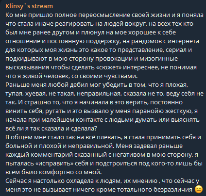 БЛЛЯЯЯяяя опять у Клинси бабская моча потекла. Целая стена хуйни про то как ей раньше надо было всем угождать, а теперь на всех похуй, это она сегодня пиздец сильно до этого додумывалась сидела. При том, что хабалке на всех и так похуй. )))
