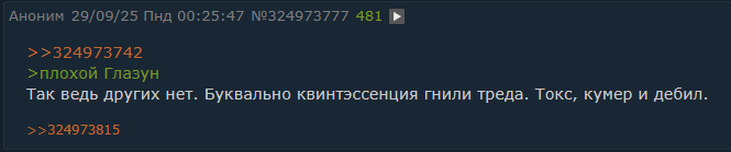 Норм тред у Лиллиса и Шипкуна. Но лучше бы он оставался дырой, импостеру Глазуна и Челю там явно не место. Отрыг выглядит нормальным, но уверен, что если спровоцировать, то сорвется в истерику, прямо как Кекс с Зигги тогда в десятках. Может кстати вкатиться туда и спровоцировать?