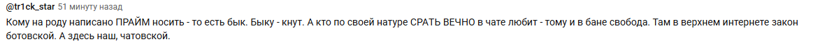 Кому на роду написано ПРАЙМ носить - то есть бык. Быку - кнут. А кто по своей натуре СPAТЬ ВЕЧНО в чате любит - тому и в бане свобода. Там в верхнем интернете закон ботовской. А здесь наш, чатовской.