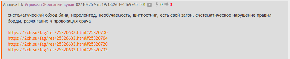 >>25320704 систематический обход бана, нерелейтед, необучаемость, шитпостинг, есть свой загон, систематическое нарушение правил борды, разжигание и провокация срача
