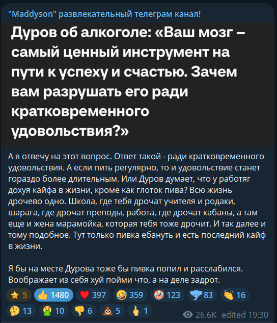 Логика дурова понятна, я +- также думаю, но это уж совсем наивная мысль, прекрасно понимаю почему я сам не пью алкоголь и не буду его пить, но реально задаваться таким вопросом на всех остальных людей это просто чушь, блять у людей просто нет нихуя, пиво блять 54р стоит в пятерочке, сука, газировка дороже уже чем пиво. Человеку с яхтами, тёлками, миллиардами, который общается с первыми людьми в мире, конечно не понять