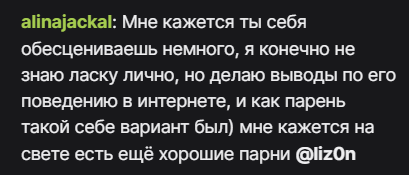 Лизон я был наверное единственным кто пытался сохранить вашу семью Я долбил летом Ласке в две соц сети и предлагал сойтись, говорил что с парнем не считается, что у него будет свободные полгода чтобы еще раз подумать и если что вернуться. Он только читал, но ни разу не ответил мне...