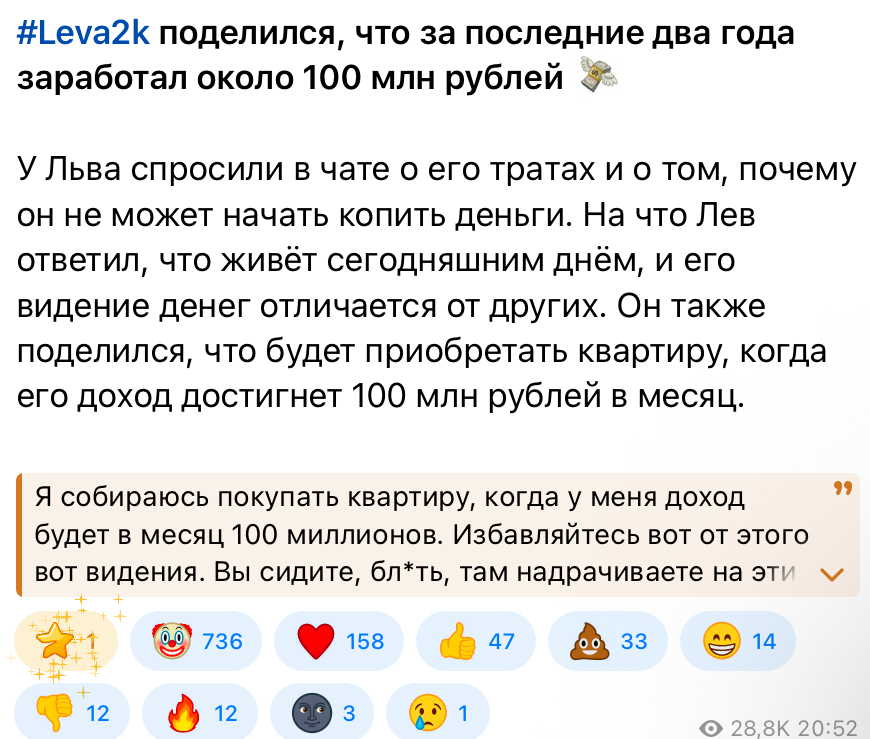 Тут ровно один вопрос который даже жыромолли задал "КУДА ТЫ ПРОЕБАЛ 100КК" тачки нет квартиры нет в евротур своей не поехал т.к денег нег типо т.е 100кк не хватает чи шо